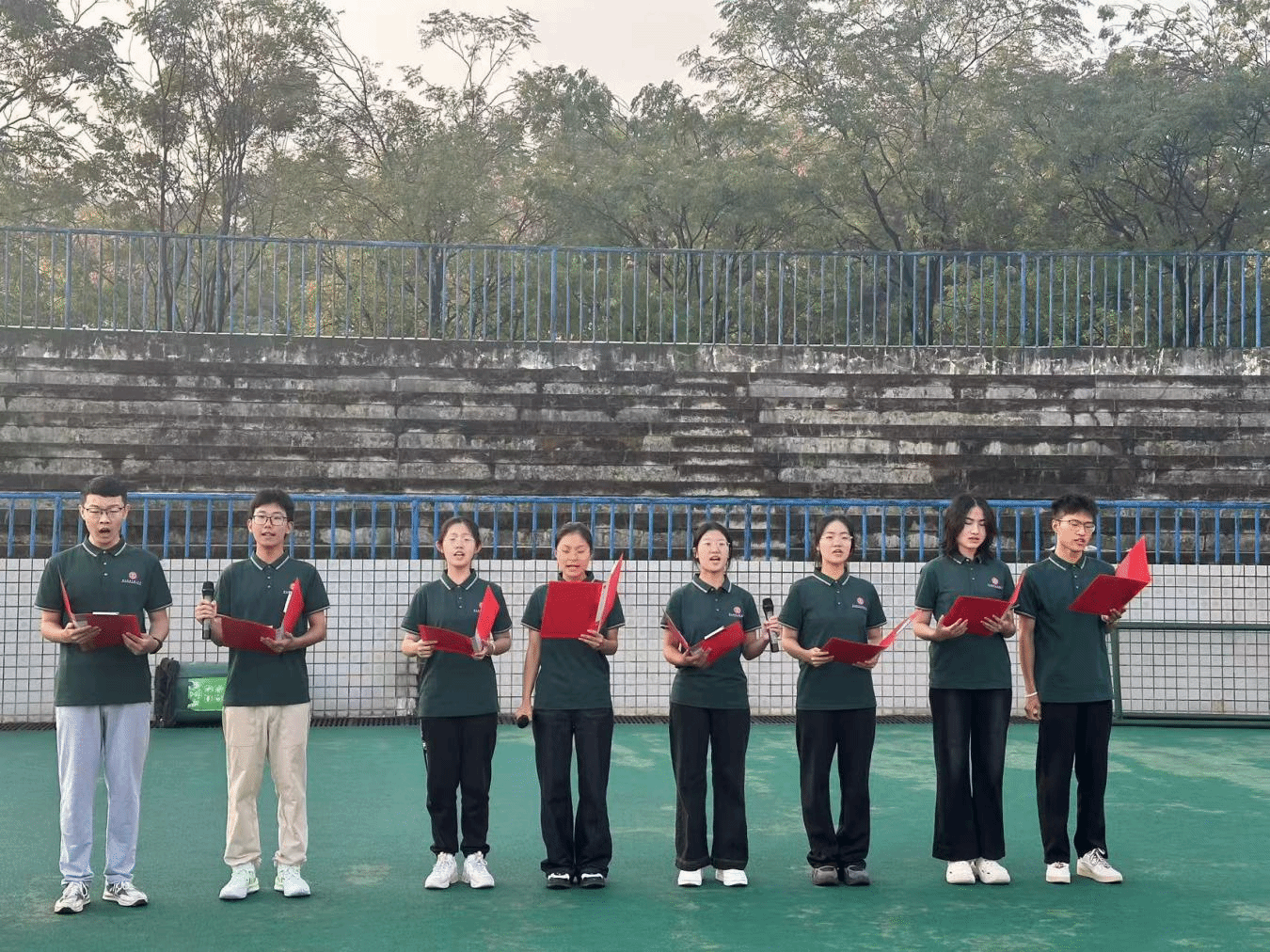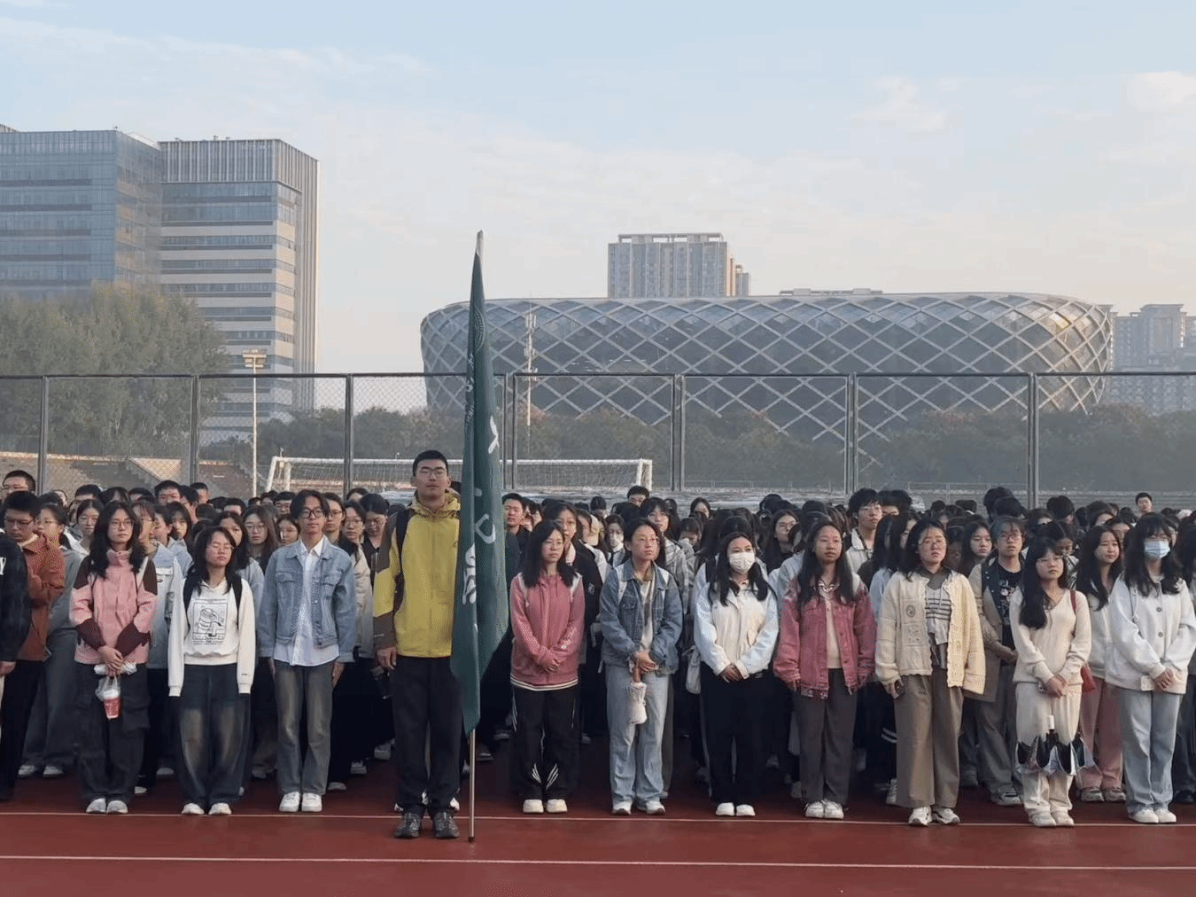 晓日初升,田径场上一派庄严静穆。国旗护卫队迈着铿锵步伐,护送国旗,走向升旗台。随着《义勇军进行曲》的雄壮旋律响起,鲜艳的五星红旗冉冉升起,全体师生肃立注目,齐唱国歌,响彻全场。