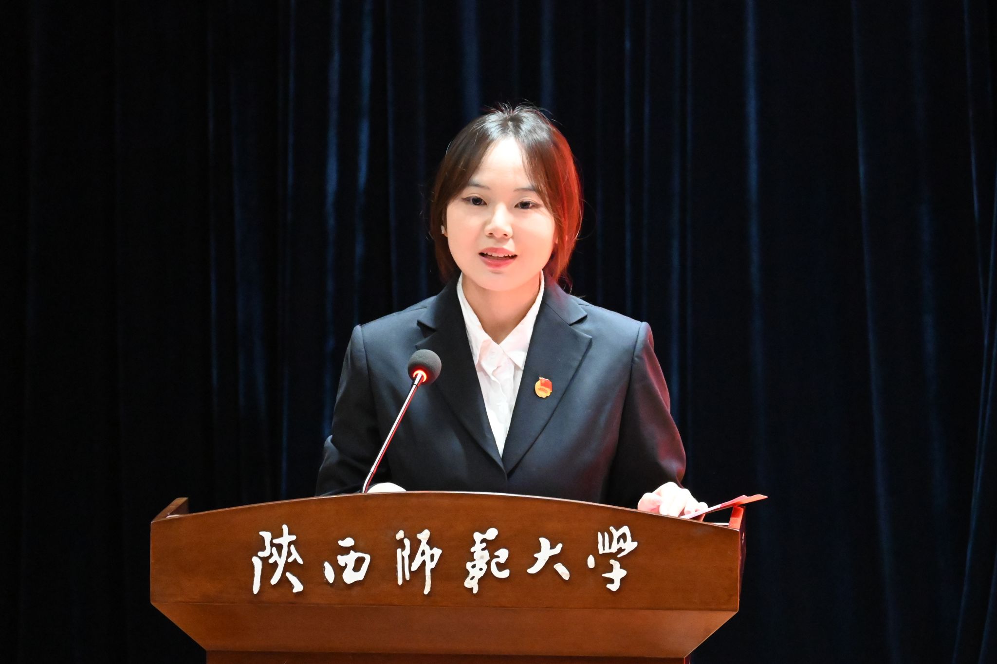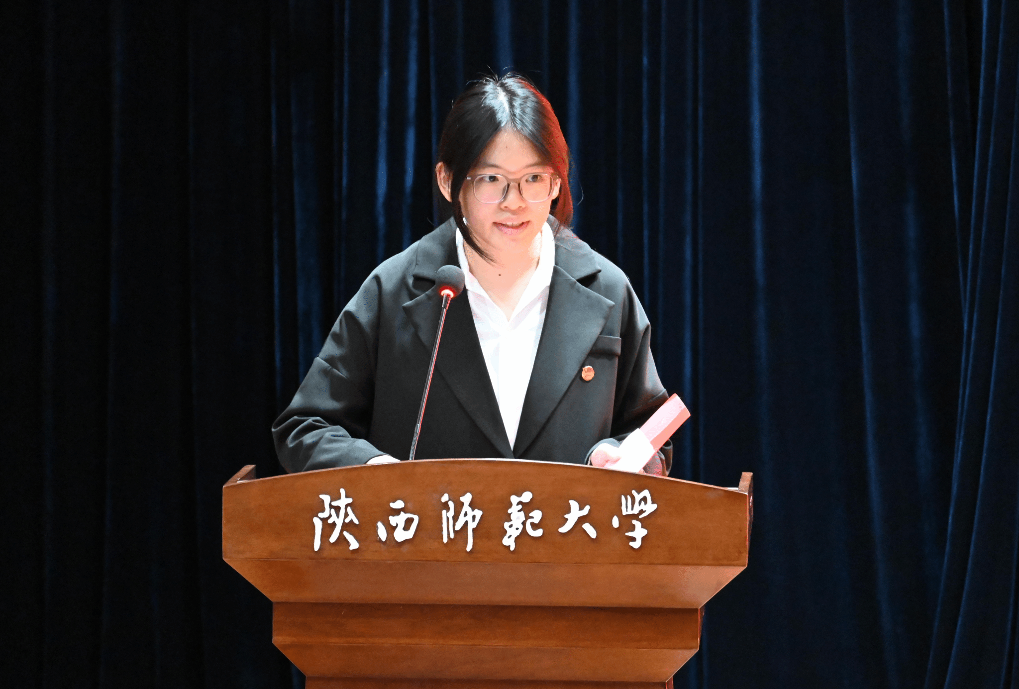 闫文杰致开幕词。他肯定了2024-2025届学生会、研究生会在过往工作中取得的成绩,强调本次大会是文苑学子参与民主实践、共商学院发展的重要载体,鼓励各位代表珍惜信任、认真履职,聚焦广大同学的普遍关切,积极建言献策,在谱写学院发展新篇章的实践中展现青春作为,努力成长为可堪大用、能担重任的栋梁之材。